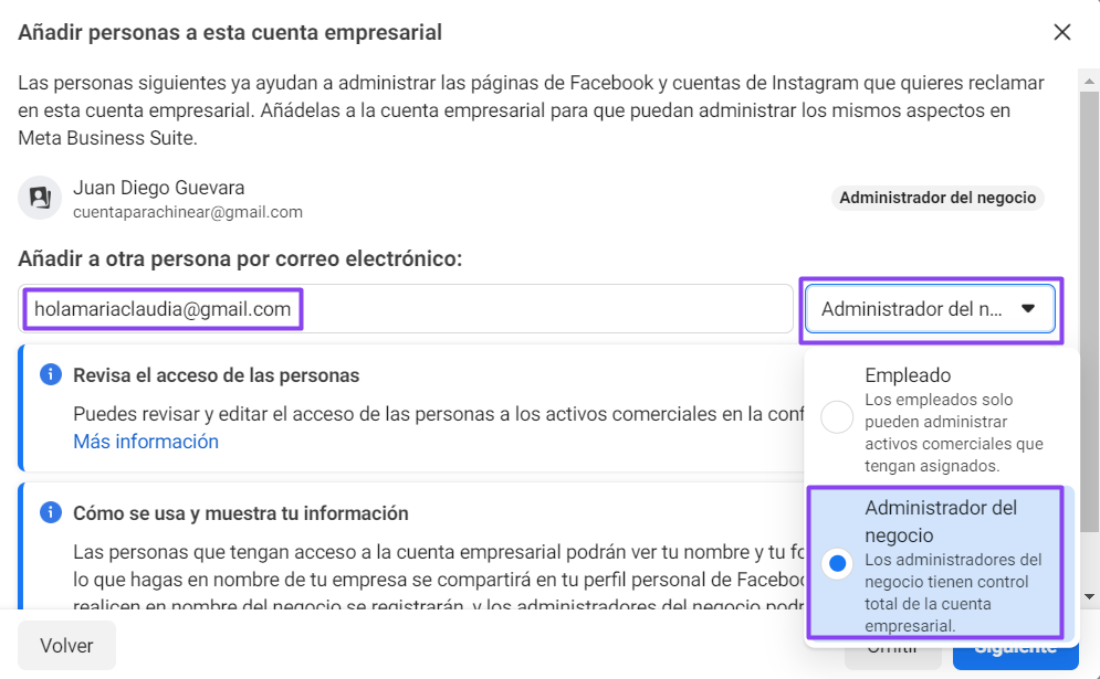 Para agregar a Aidu, escribe su correo holamariaclaudia@gmail.com, y ponla como «Administrador de negocio»