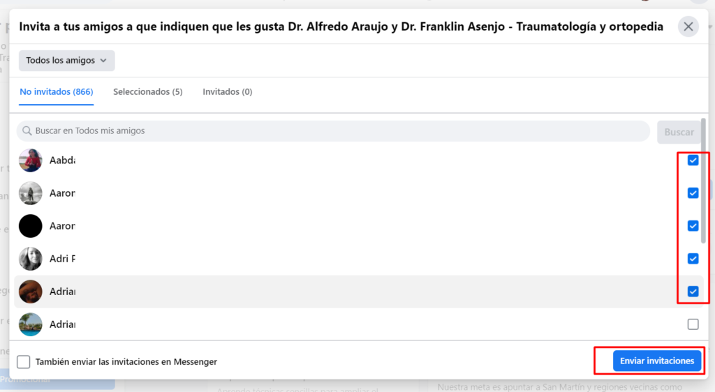 Selecciona con el check azul a todos tus amigos, y haz click en Enviar invitaciones:
