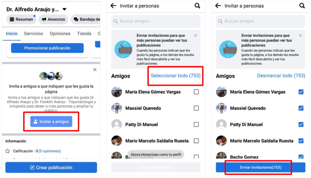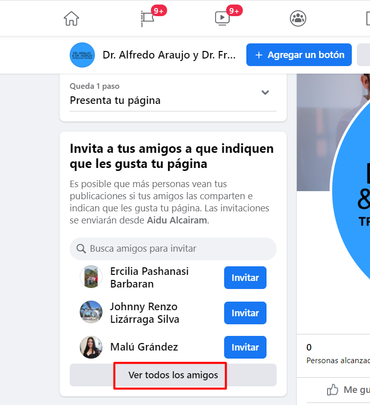 Ingresa a la fanpage de Facebook, y busca la opción de Invitar a amigos. Luego, haz click en Ver todos los amigos: